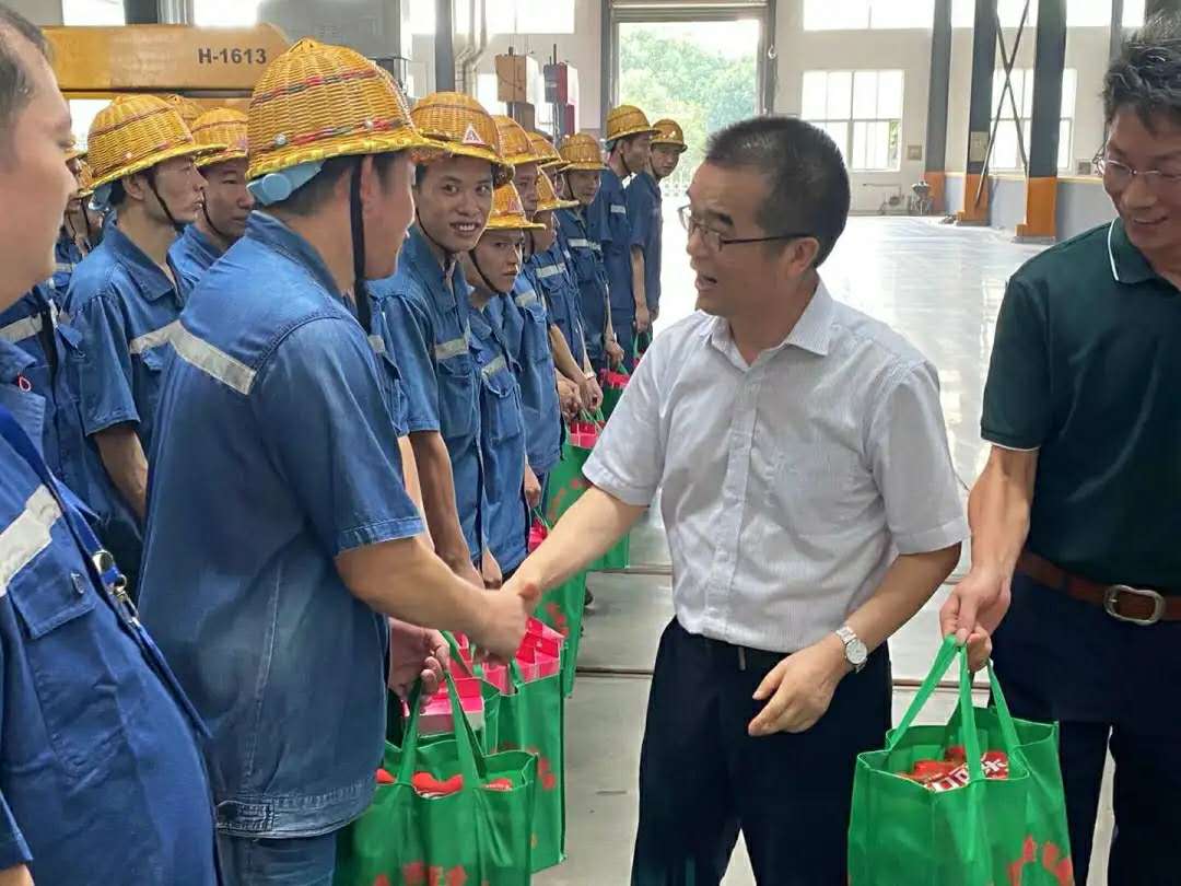 On August 18th, Mr. Han Pengjun, Vice Chairman of Ningbo Federation of Trade Unions, Mr. Tang Jiandong, Chairman of Ningbo Finance and Trade Union, and other delegations went to Ningshing Special Steel Group (NSSG)for summer cooling visit and express condolences and consideration to the front line employees who stuck to their posts and worked hard in extreme heat, and delivered cool drinks and pharmaceutical goods for preventing heatstroke and cooling as well. Ms. Gao Ping, Vice Chairman, Party Secretary and Trade Union Chairman of Ningshing Holdings, Mr. Wang Wentong, Vice President of Ningshing Holdings and Chairman of NSSG, and Mr. Yan Jianbin, General Manager of NSSG, greeted with hospitality.