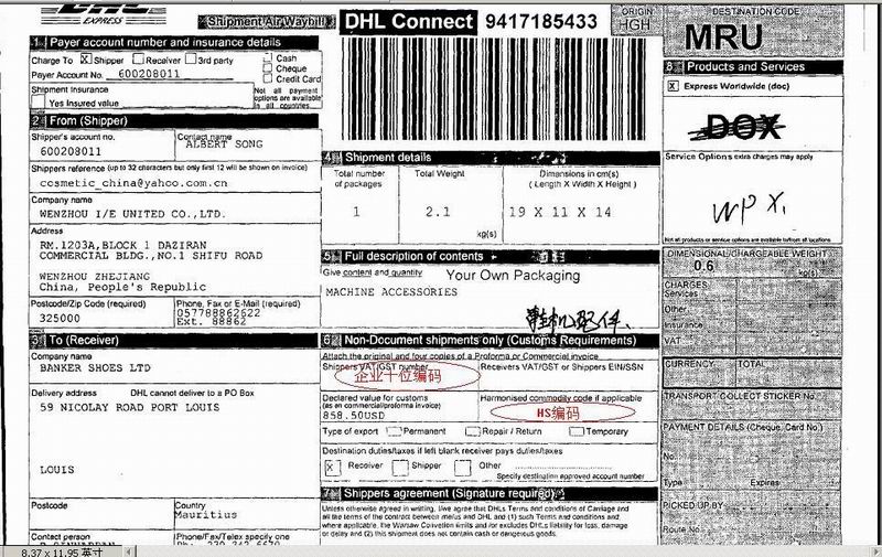 依据上述海关公告,各快件公司要求我司在邮寄出口货样和广告品时,请务必在快件运单上显示我司的海关10位注册编码和所寄物品的H.S.编码